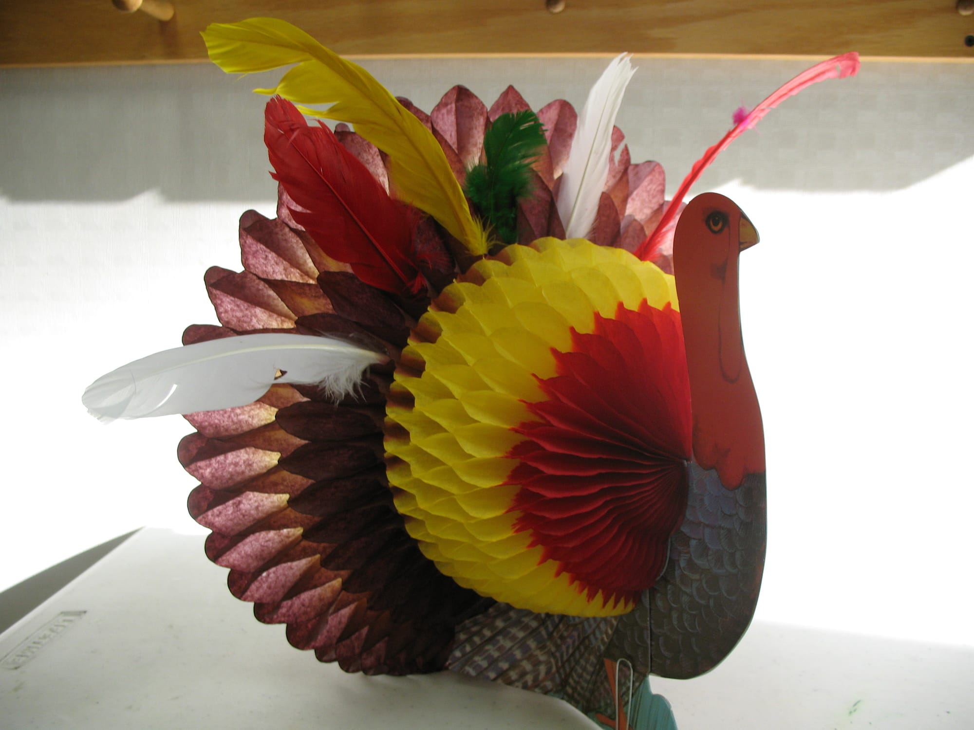 Next, I gave each student a feather from the craft store. I showed them this turkey decoration (the kind that folds flat to store but unfurls into a kind of fan for show) and we said this rhyme: