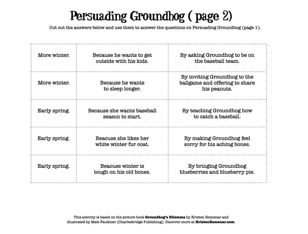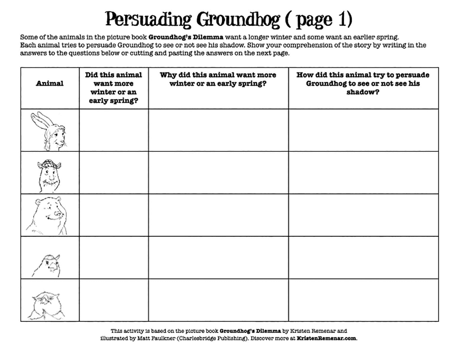 Announcing six more weeks of winter earns Groundhog both friends and grumblers. When Groundhog sees his shadow, half the animals cheer, and the other half groan. But things really go downhill when spring finally arrives. Bear and Squirrel see nap-happy Hare give Groundhog a basket of berries as a gift for the extra weeks of slumber, so Squirrel invites him to a ballgame, hoping to cozen Groundhog into declaring an early spring next year. Though he initially protests, "I don't actually control the weather. I just report it," he finds that he's enjoying the attention. Pretty soon, Groundhog gives in, and his social calendar fills up with picnics, bonfires, and more ballgames. Stricken by conscience as winter nears, he goes to the barn for advice from Owl, who simply says—wisely—that Groundhog got himself into this problem and must solve it himself. When Groundhog Day rolls around again, he risks disfavor by telling the truth and invites his friends to his home for a warm-up and some snacks. And so they pass much of those six extra weeks of winter, comfortably. Faulkner's anthropomorphic animals and vibrant colors recall Uncle Wiggly, and the illustrations are packed with humorous details that repay re-readings. Remenar's graceful prose and the subtlety of her message, pitched to older preschoolers and early-elementary students, are a good match.