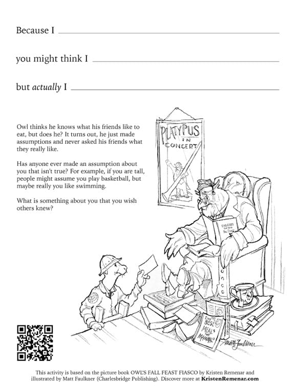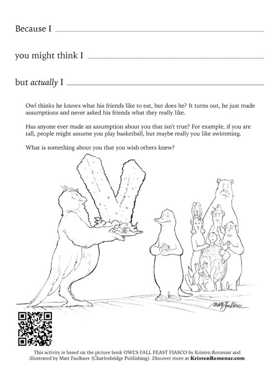 Owl makes all kinds of incorrect assumptions about his friends. Share "Owl's Fall Feast Fiasco" with your kids and ask them if anyone has ever made any assumptions about them that were way off. For example, because my son is tall, many people ask him if he likes playing basketball, but really my son prefers rock wall climbing and disc golf. And my daughter will choose a sword over a tiara any day! Print off the sheets below for a free writing activity and a great discussion starter!